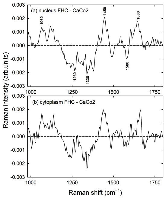 The differences of mean spectra, shown in Figure 2a,b for the nucleus and cytoplasm regions, respectively, provide preliminary information on the relative content of the cell components in the two cell types. In fact, the positive peaks in Figure 2 represent a larger relative content of the peak-related components in the healthy cells than in the cancer cells, whereas the opposite occurs for negative peaks. Thus, the positive peaks at about 1060 and 1450 cm−1 suggest a larger relative amount of lipids in healthy cells than in cancerous ones. Negative signals at about 1338 and 1580 cm−1 also indicate a larger relative content of nucleic acid components in the cancerous cells with respect to the healthy cells. Figure 2 shows larger uncertainty about relative protein content; in fact, positive peaks at about 1660 cm−1 suggest larger protein content in healthy cells than in cancerous cells, whereas negative signals in the 1200–1280 cm−1 range indicate the opposite.