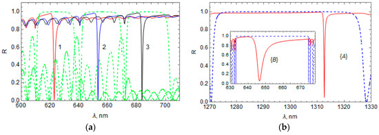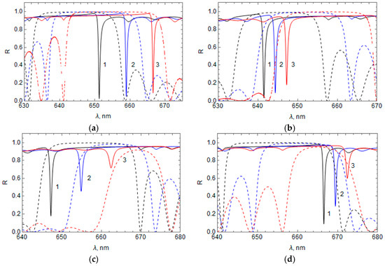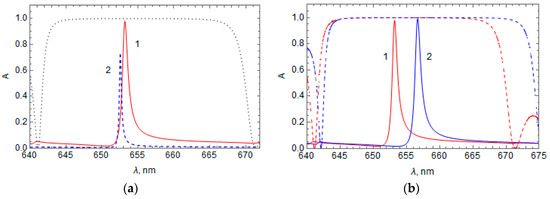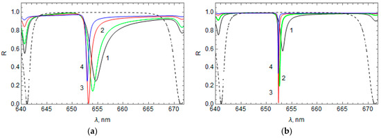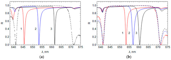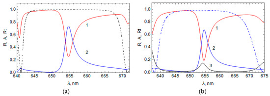 Figure 2 shows the calculated spectral distribution of the reflection, absorption, and transmission coefficients in the HPLCG band gap region of the hybrid structure with a metal film of Au and LC 5CB, where the HPLCG thickness is (Figure 2a) and (Figure 2b). Figure 2a shows that the HPLCG thickness is substantially thick such that the transmission is zero throughout the spectral region of the HPLCG band gap, but at a wavelength of 653 nm there is a peak in the absorption coefficient and a dip in the light reflectance coefficient. This dip in the reflectance occurs due to the light absorption, which is identified with the excitation of OTS at a wavelength of 653 nm [1,2,3,4]. When the HPLCG is not thick enough, some of the light energy at this wavelength passes, causing a transmittance peak, as seen in Figure 2b for HPLCG thickness .