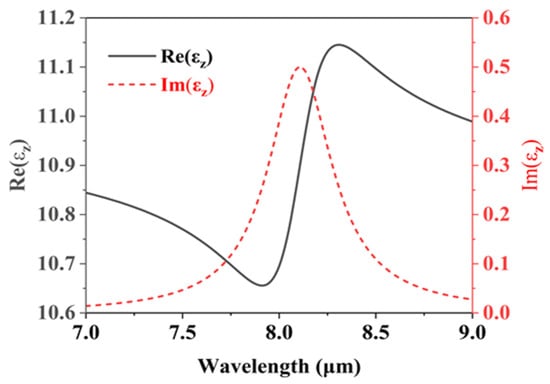 Figure 2 shows the real and imaginary parts of the relative permittivity in the z-direction for the active region of the designed quantum well structure. Figure 3a depicts the absorption spectrum of the long-wavelength GaAs/AlGaAs QWIPs, where the black line represents the LCP light source and the red line represents the RCP light source. Three peaks are observed at wavelengths of 7.5 μm, 7.9 μm, and 8.0 μm, corresponding to the microcavity mode [,], the SPP mode [,], and a hybrid mode [] of the two. In the SPP mode at 7.9 μm, the maximum absorption for LCP light source is 0.8, while the absorption for RCP light source is only 0.25. Across all three operating modes, the device exhibits significantly higher absorption for LCP light sources compared to RCP light sources. Figure 3b displays the coupling efficiency of the active region of the quantum well as a function of wavelength. When the LCP light source is incident, the coupling efficiency reaches 2700% at 7.9 μm and 870% at 8.0 μm. On the other hand, when the RCP light source is incident, the coupling efficiency at 7.9 μm and 8.0 μm is 60% and 540%, respectively. Figure 3c represents the CPER of this QWIP device with a maximum value of 45 at 7.9 μm.