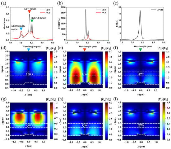 (a) Absorption spectrum of the device; (b) variation of coupling efficiency with wavelength; (c) CPER of the device; (d–f) |Ez|/|E0| of LCP light at 7.5 μm, 7.9 μm. and 8.0 μm wavelengths, respectively; (g–i) |Ez|/|E0| of RCP light at 7.5 μm, 7.9 μm, and 8.0 μm wavelengths, respectively.