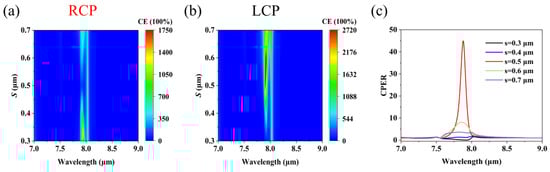Effect of changing the grating width s: (a) diagram of CE and wavelength under RCP light; (b) diagram of CE and wavelength under LCP light; (c) diagram between CPER and wavelength.
