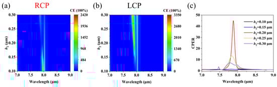 Due to the dominant role of SPP waves excited by the bottom gold stripe grating in the three operating modes, this study investigates the influence of the grating width (s) and thickness (h2) on the device performance. As shown in Figure 4a,b, we examine the relationship between the coupling efficiency (CE) and the response wavelength for different grating widths (s). When RCP light is incident, the CE initially decreases and then increases at the SPP wave response wavelength of 7.9 μm as s varies from 0.3 μm to 0.5 μm, reaching a local minimum at s = 0.5 μm. When LCP light is incident, the CE reaches a local maximum at s = 0.5 μm. It can be observed that at s = 0.5 μm, the SPP effect is suppressed under RCP light and enhanced under LCP light, resulting in a significant difference in CE between the two polarizations. Therefore, the QWIPs exhibits the ability to distinguish the rotational direction of circularly polarized light. Due to the unchanged parameters of the top double L-shaped chiral structures, the response wavelength and intensity of the microcavity effect excited at 8.1 μm tend to stabilize, regardless of whether it is RCP light or LCP light. From Figure 4c, it can be visually observed that the CPER reaches its maximum value at s = 0.5 μm. It should be noted that when s is between 0.3 μm and 0.4 μm, the CPER value between 7.6 μm and 8 μm is less than 1, indicating that under this condition, the CE for RCP light is stronger than that for LCP light.