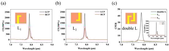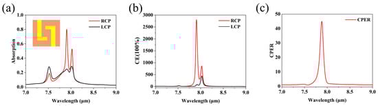 In order to investigate the circular polarization selectivity of double L-shaped chiral structures, we manipulated the position of the top double L-shaped structure by symmetrically flipping it about the x-axis, thereby modifying the device’s target polarization to RCP light. Figure 8a illustrates the absorption spectrum of the flipped device, with an inset schematic of the right-handed chiral double L-shaped structure targeted towards RCP light. The numerical values of absorption peaks, peak wavelengths, and peak absorption ratios remain consistent with the results in Figure 3a. However, RCP light plays a dominant role rather than LCP light. Figure 8b and Figure 8c, respectively, demonstrate the coupling efficiency curve and the CPER of the right-handed chiral double L-shaped structure. At the peak wavelength of 7.9 μm, the coupling efficiency under RCP light hits 2700%, which is significantly higher than the 60% under LCP light. Similarly, at the wavelength of 8.1 μm, the coupling efficiency of RCP light surpasses that of LCP light. This stands in stark contrast to the results in Figure 3b. The peak CPER in Figure 8c is consistent with that in Figure 3c; however, the CPER here is obtained by calculating the ratio of coupling efficiencies between RCP and LCP light. These results confirm that this design can achieve free selection of detecting the target rotation of circularly polarized light by altering the layout of the double L structure, thereby exhibiting wide applicability.