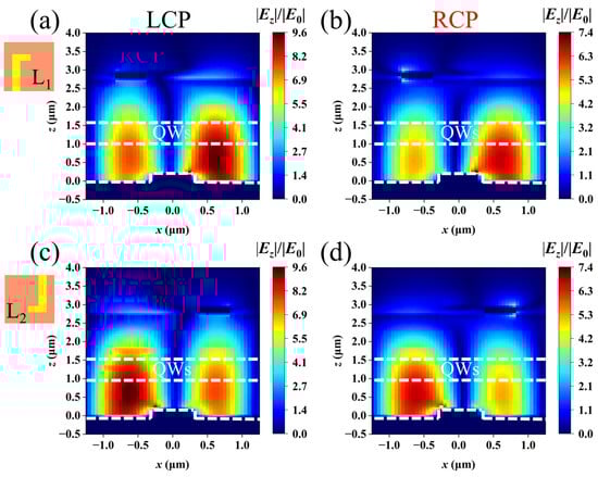 Subsequently, we analyzed the electric field distribution of the single L-shaped structure. Figure 7a and Figure 7b, respectively, present the |Ez|/|E0| of the L1 structure under LCP and RCP light at the peak wavelength of 7.9 μm in xoz plane. The maximum enhancement of |Ez|/|E0| for the LCP incident reaches 9.6 times, surpassing the 8.7 times observed for the double L-shaped structure in Figure 3c. This is attributed to a considerable portion of incident light directly transmitting into the cavity through the uncovered top contact layer by the L-shaped structure, thereby enhancing the local field. However, this portion of incident light is not converted by the top chiral metasurface and the excited SPP effect is limited, resulting in an overall coupling efficiency lower than that of the double L-shaped structure. This also explains why the peak coupling efficiency in Figure 6a,b is lower than 2500%. In Figure 7b, the maximum enhancement of |Ez|/|E0| caused by the SPP waves reaches 7.4 times, which is weaker than that of LCP light. This confirms that the single L-shaped structure also possesses a certain ability to discriminate the rotation direction of circularly polarized light, although with a smaller difference between the LCP and RCP light compared to the double L-shaped structure. This explains why the CPER of the single L-shaped structure is lower than that of the double L-shaped structure in Figure 6c.