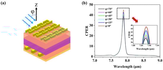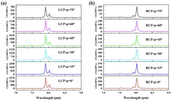 In addition, we calculated the coupling efficiency of the device under different incident angles ranging from 0° to 75°, as illustrated in Figure 10a,b. For LCP light, the coupling efficiency significantly decreases with an increasing incident angle. When the incident angle φ = 75°, the coupling efficiency decreases to only 780%. However, when incident angles φ < 60°, the coupling efficiency remains at a relatively high level, exceeding 1000%. This indicates that the device maintains good coupling efficiency over a wide range of operating angles, demonstrating excellent angle independence. In contrast, under an RCP infrared incident, the polarization selectivity of the bottom gold stripe grating suppresses the excitation of SPP modes, resulting in generally lower coupling efficiency. Under normal incidence, the peak coupling efficiency under RCP light incidence is much lower than that under LCP light incidence. As the incident angle gradually increases, the coupling efficiency of the device continuously decreases. When the incident angle φ = 75°, the coupling efficiency drops less than 200%. The big difference in the coupling efficiency between LCP and RCP light confirms that the device has high circular polarization discrimination capability, which is consistent with the CPER results in Figure 9b.