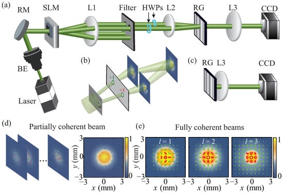 The diffracted light from the SLM then enters a common path interferometric system, which is composed of two thin lenses L1 and L2. The SLM is positioned in the input plane of the system, while a two-pinhole filter is located in the frequency plane (rear focal plane of L1) to selectively extract two diffraction orders. These beams are subsequently converted into x- and y-polarized states using half-wave plates (HWPs). In the output plane (rear focal plane of L2), a Ronchi grating (RG) is employed to superpose the two orthogonal modes into a single random vector mode []. By dynamically displaying the holograms on the SLM, the partially coherent beam source with an FP polarization state encoded in it can be synthesized immediately after the RG. The number of the holograms required for synthesizing the partially coherent beam depends on the spatial coherence area of the beam. As the spatial coherence area decreases, the necessary number of holograms increases. In our experiment, we utilize holograms to synthesize the partially coherent beam with low spatial coherence, which shows a good robustness property during propagation. The thin lens L3 in Figure 1a is used to image the beam source onto the CCD. The distances between the RG and L3, and between L3 and CCD, are both equal to , where is the focal distance of L3. As shown in Figure 1c, when L3 is placed immediately after RG, the focusing properties of the partially coherent beam can be studied.