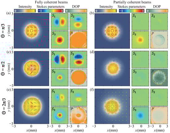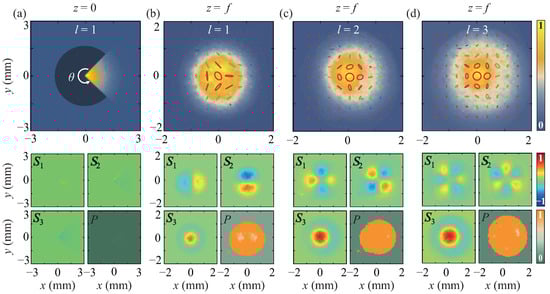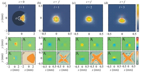 In addition to the asymmetry vortex phases, the obstruction encountered by the fully FP beam during its propagation also influences its polarization distributions. In our experiment, we introduce a sector-shaped obstacle with an angle of and place it in the source plane to partially block the FP beam. Figure 5a shows the blocked FP beam with in the source plane, where both the intensity and polarization state of the beam are affected due to the obstacle. We can see that only the unobstructed part of the FP beam is retained. The experimental results depicting the distributions of the polarization information in the focal plane for the FP beams with different topological charges are presented in Figure 5b–d. As expected, the Stokes parameters (and, therefore, the polarization state) in the focal plane undergo distortion due to the obstacle placed in the source plane. These findings suggest that fully coherent FP beams are highly sensitive to disturbances in their propagation path. Even when the fully coherent FP beam is not completely blocked, the asymmetry in vortex phases within the beam induces rotation during its propagation.