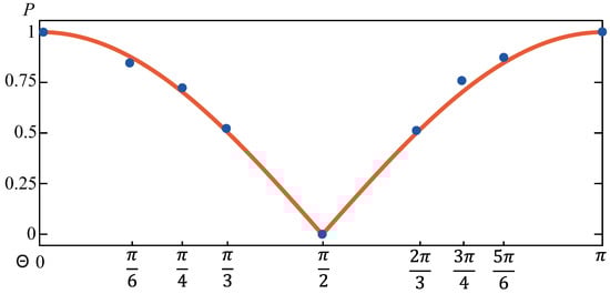 To examine whether the condition shown in Equation (14) holds, we present experimental results (depicted as blue dots) in Figure 3 for the variation of the local degree of polarization P for the partially coherent beam in the source plane with the polar angle of the encoded FP polarization state. The red solid curve in Figure 3 represents the theoretical result based on Equation (14). It is evident that the local degree of polarization of the synthesized partially coherent beam can be controlled by the polar angle of the FP polarization state. For the cases when and , the polarization states for the FP beams are located at the northern and southern poles, respectively. The FP beams, therefore, become uniformly polarized with the vector quality factor . The local degree of polarization for the corresponding partially coherent beams becomes 1. When , the vector quality factor for the FP beam and the local degree of polarization for the corresponding partially coherent beam becomes 0. For other values of , the local degrees of polarization for the partially coherent beams align well with the condition in Equation (14). Our experimental results are consistent with the theoretical predications.