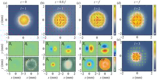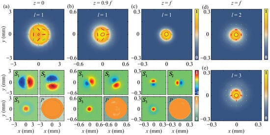 Next, we study the propagation properties for the fully coherent FP beams and for the partially coherent beams with FP polarization states encoded in the spatial coherence structures. Figure 4a–c present the experimental results for the Stokes parameters and polarization states of the focused fully coherent FP beam with and at various propagation distances. In the source plane (), we find that the fully coherent FP beam is well synthesized in the experiment with its polarization state being consistent with the simulation result shown in Figure 1e. Both the spatial distributions for and exhibit the two-petal shape, with mirroring the shape of through a 90-degree clockwise rotation. The spatial distribution of , on the other hand, displays rotational symmetry, featuring positive in the central area and negative in the surrounding regions. As the fully coherent FP beam propagates, its polarization state undergoes a counterclockwise rotation. Upon reaching the focal plane (), the polarization state rotates 90 degrees counterclockwise compared to its orientation in the source plane. This rotation is attributed to the vortex phase embedded in the left-handed circularly polarized mode [refer to in Equation (4)] of the FP polarization state. The asymmetry in vortex phase distributions within and contributes to the observable rotation. In contrast, if the vortex phases in and are symmetric (e.g., for a radially polarized beam), the rotation of the polarization state would not be visible during beam propagation. Figure 4d,e showcase experimental results for the focal-plane intensities and polarization states of FP beams with topological charges and . Notably, the observed rotation angle of the polarization state adheres to the condition .