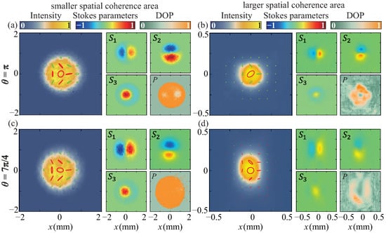 The quality of the focal-plane FP polarization state is clearly related to the spatial coherence of the engineered partially coherent beam source. In our experiment, we investigated the relationship between the source’s spatial coherence and the quality of the focal-plane polarization by manipulating the spatial coherence of the beam source and adjusting the size of the obstacle. In Figure 8, we examine two scenarios with lower and higher spatial coherence compared to Figure 6 and Figure 7. The sector-shaped obstacles have angles of and , representing smaller and larger obstacles, respectively. The spatial coherence of the partially coherent beam is controlled by varying the beam waist of in the experiment. Figure 8a illustrates the spatial distributions of polarization information in the case of a lower spatial coherence and a smaller obstacle, demonstrating the attainment of a high-quality FP polarization state in the received plane. In contrast, Figure 8b presents spatial distributions for a higher spatial coherence and a smaller obstacle, revealing slightly distorted patterns in intensity and polarization state, lower contrast in the Stokes parameters, and a reduced degree of polarization. This emphasizes that a higher spatial coherence results in the lower quality and less robustness of the focal-plane FP polarization state. Subsequently, we increased the angle of the sector-shaped obstacle. As shown in Figure 8c, due to the smaller spatial coherence, the high-quality FP polarization state can still maintain in the focal plane. However, in the case of the higher spatial coherence, the quality of the FP polarization state in the focal plane is obviously abnormal as shown in Figure 8d. A comparison of the degrees of polarization between Figure 8b,d reveals that with the increase in obstacle area, the beam in the focal plane becomes less polarized.