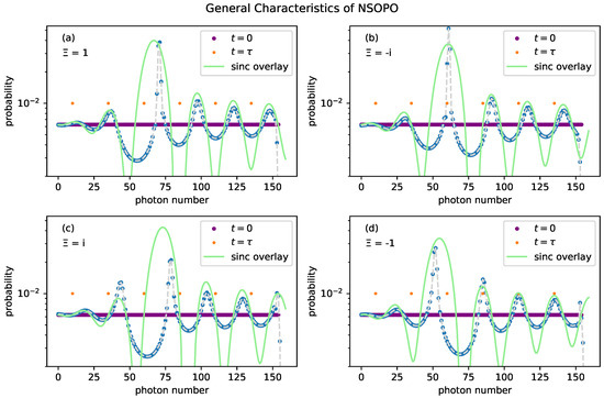 The time-dependent Schrödinger equation corresponding to the interaction Hamiltonian, Equation (26), is numerically evolved with a Crank–Nicolson method, which preserves unitarity. Figure 1 reveals the characteristic behavior of NSOPO. It shows that probability amplitude tends to coalesce around number states separated by a spacing