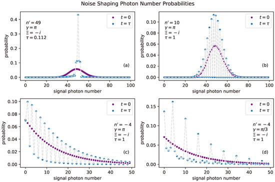 These shaping principles can be applied in several ways. Setting such that the shape center is aligned with the peak of a state and the peak spacing s to be greater than the width of the state, the photon number probability will coalesce into an approximate Fock state. Figure 2a illustrates this process, generating a state with signal photon number probabilities , . Alternatively, if the shape center is set far from the concentration of initial state probabilities, clean periodic oscillations in photon number probabilities, with a period s, are introduced into the state. Figure 2b–d illustrate this process: (b) shows precision shaping of a coherent state with ; (c) is the same as (b) but acting on a two-mode squeezed vacuum; (d) shows shaping with .