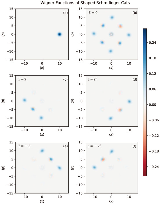 Equation (27) provides a similar constraint regarding NSOPO peak spacing. If we suppose , then , making Equations (30) and (27) the same constraint with . Setting , we obtain a four-phase Schrödinger cat state. Figure 3 shows the action of NSOPO on a coherent state, (a), that is split into a generalized four-phase Schrödinger cat state, (b). Depending on the phase , NSOPO restricts the amplitude of the cat to two of four phases, shown in (c–f). The axes in each plot are independent phase space quadratures of the displacement field. Not shown in Figure 3, shifting the shape center by one rotates the action of NSOPO among the operations shown in (c–f). Namely, under , the plots map to each other according to . This behavior alludes to efficient quantum logic gates for macroscopic quantum states, though further investigation is needed to understand the range of this capability.