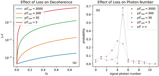 Figure 4 shows the effect of incoherent loss on the generation of an approximate Fock state, similar to that shown in Figure 2a. In this instance, an initial product state of a signal/idler two-mode coherent state with amplitude and a large coherent pump state is evolved according to the local Lindblad master equation