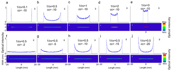 (i) The 2D beam profiles and (ii) 1D intensity across the central horizontal lines for (a–e) varying cv and (f–j) varying cc.