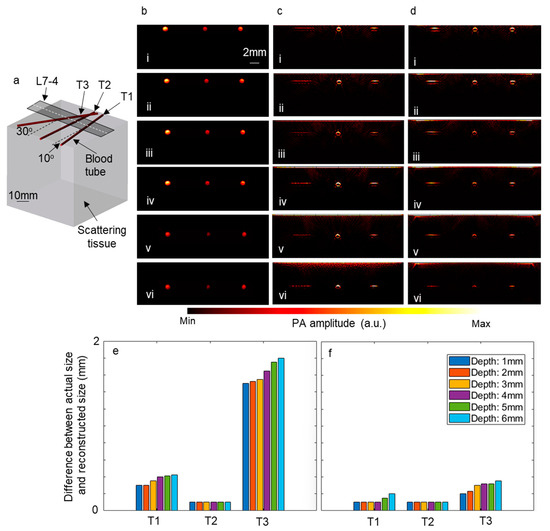 Furthermore, to explore the impact of employing a linear array of optical fibers and a Powell lens on the reconstructed images, simulations were conducted using the k-Wave toolbox (Version 1.4). In these simulations, three blood tubes were inserted into a scattering medium at three different angles, as depicted in Figure 7a. Subsequently, the tubes were moved to deeper depths, and the time reversal algorithm was utilized to reconstruct the image directly beneath the ultrasound transducer. The computational grid size was set to 600 × 600 × 600 voxels, with each voxel measuring 90 μm. L7-4 ultrasound transducers comprising 128 elements were modeled for these simulations. Figure 7b–d display the initial pressure, reconstructed images using a linear array of optical fibers, and those using a Powell lens, respectively, on the slice underneath the white dashed line in Figure 7a. Figure 7b(i–vi) represent the initial pressure generated by blood tubes at depths ranging from 1 mm to 6 mm, with increments of 1 mm. Additionally, the difference between the diameter of the blood tubes in the reconstructed images and the diameter of the blood tubes in the initial pressure image was calculated for each depth, with the results depicted in Figure 7e (using a linear array of optical fibers) and Figure 7f (using a Powell lens). It is observed that for blood tubes positioned at a 0° angle, both scenarios exhibit similar performance, while for blood tubes positioned at 10° and 30° angles, the Powell lens demonstrates superior performance.