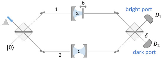 Modes 1 and 2 are propagation modes along paths 1 and 2 of the interferometer, as shown in the upper interferometer of Figure 2. This superposition of modes, or path-entangled state, is prepared by sending a single photon across a 50–50 beam splitter at the entry of the interferometer (while the other input port is in the vacuum state). Only one mode of the system interacts with a coherent beam, which propagates along the arm c of a second interferometer (lower interferometer in Figure 2). The nonlinear interaction between the beam and the single photon occurs in a Kerr medium and is described by the unitary operator . The parameter is the phase shift generated by a single photon on the probe beam, while is the number operator for mode 1 (a system variable) and the number of photons in mode c (an apparatus variable). In Figure 2, one can note that there is also a reference beam that propagates along arm d of the second interferometer. This beam does not interact with the system and allows the extraction of the phase shift by reading the difference of photons at detectors and . Consequently, the “measurement device” has a two-mode structure and is initially prepared in the pure state