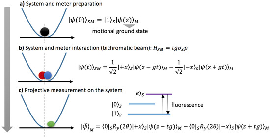 Schematic description of an experiment performed in [43,44], in which the axial displacement of a trapped ion is amplified. (a) The vibrational degree of freedom (measurement device) starts cooling down to its ground state , while the internal electronic state (measured system) begins in the -eigenstate . (b) An interaction Hamiltonian couples the system spin (along the x-direction) with the momentum of the meter by means of a bichromatic laser, producing the entangled (system-meter) state . Please note that the effective coupling constant is . Therefore, control of the interaction time allowed the exploration of the full weak-to-strong transition. (c) After applying a qubit rotation along the y-direction, , postselection of the internal state is made by no observing fluorescence. In this case, the conditional (un-normalized) meter state is . (d) Whenever postselection has been successful, the probability density of the meter’s position is reconstructed using the method described in [45]. This figure was completely redrawn by the autors, taking Figure 1 of [43] and Figure 1 of [44] as references.
