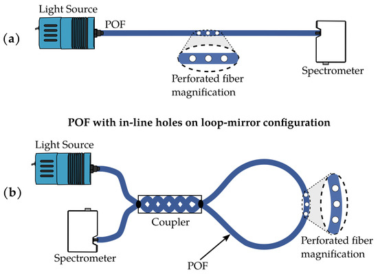 The plastic optical fiber loop mirror (POFLM), shown in Figure 1b, comprises a drum with a 10 cm diameter, around which the 1.5 m POF is coiled. For the POFLM, the coupler manufacturing process follows the same procedure as described in [15]. However, in this study, additional environmental protection was provided to the coupler by enclosing it within a metallic tube. Subsequently, the transmission of several fibers and POFLMs with multiple perforations was measured, as depicted in Figure 1. The interrogation system consisted of a tungsten lamp that served as a broadband light source, as well as an spectrometer (Ocean Optics, model USB2000CXR, Dunedin, FL, USA) that aided in measuring the optical signals at the output of the filters. Thus, the characterization of the spectral filter was conducted by measuring the transmittance as a function of the number of holes.