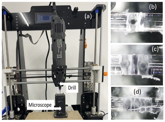 The in-line sub-millimeter holes were created using a computer numerical control (CNC) mounted drill for 3D printing, as illustrated in Figure 2a. A 200-μm-diameter drill was employed in the process, with a commercial optical microscope (SHENZHENSHI SHENGY, Futian district, Shenzhen, China) used for the real-time monitoring of the perforation. Figure 2b–d illustrate the POFs with one, two, and three perforations, respectively.