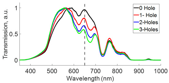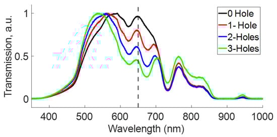 The experimental results confirm that the spectral transmission of the POF is indeed modified by the presence of holes, as illustrated in the traces in Figure 3. These measurements, depicted in a straight line, as shown in Figure 1a, reveal two significant regions. The first region spans approximately 470 nm to 600 nm, where the spectral transmission experiences a blue shift with an increasing number of holes in the POF. In this region, at maximum transmission, the traces exhibit a blue shift of 587 nm, 567 nm, 556 nm, and 536 nm for zero, one, two, and three holes in the fiber, respectively. The second region, encompassing 600 nm to 710 nm, shows a decrease in transmission intensity as the number of holes in the POF increases. Specifically, at 650 nm (indicated by the dashed line in Figure 3), a second peak displays a decrease in transmission intensity at zero, one, two, and three holes and the respective transmission values (0.963, 0.792, 0.597, and 0.438). This peak also exhibits a modest blue shift as the number of holes is increased. Moreover, the first region indicates a bandpass of approximately 115.78 nm, measured as the full width at half maximum (FWHM). Considering both regions, the estimated period of the spectral filter is around 120 nm. It is essential to note that the traces are normalized, for the sake of comparison, as fibers with more holes exhibit a lower transmission intensity.