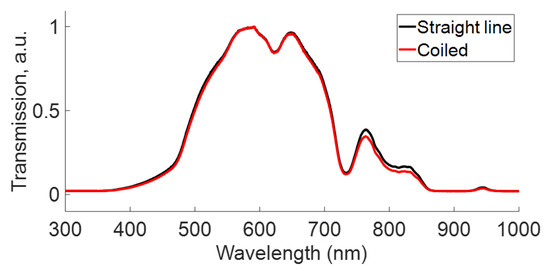 Figure 6 illustrates that the spectral transmission remains unaffected by the curvature introduced by coiling the fiber on a drum with a 10 cm diameter. However, no significant variations in the transmission traces were observed within the range of 400 nm to 850 nm, with a minimal difference of 0.0414 in the intensity at 764 nm. From the observations presented in Figure 6, we can conclude that the curvature of the fiber in the drum does not alter the spectral transmission.