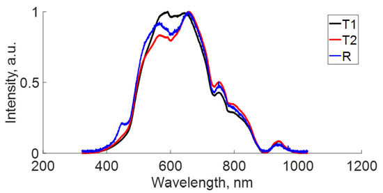 The optical directional coupler serves as a crucial component in the construction of a fiber loop mirror. For characterization purposes, we measured the spectrum at the output ports of a specially manufactured directional 2 × 2 coupler. The coupler was developed using the twisting technique of a POF along approximately 5 cm, as illustrated in [15]. It is essential to note that one port of the coupler serves as the input for light. The output ports are designated as follows: the output port of the active fiber (the same input fiber) is marked as T1, the output port of the passive fiber (which receives the signal from the active fiber) is marked as T2, and the output port where the signal is reflected by Fresnel reflection is marked as R. The spectra measured at each port are depicted in Figure 7.
