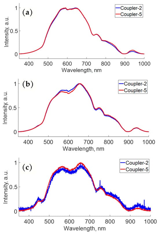 Slight variations during manufacturing may impact the signals at different output ports, particularly in terms of the coupling ratio. However, here, deliberate changes were introduced during manufacturing—specifically, variations in the torsion of the coupler—to assess the spectral influence of these changes at each output port. Figure 8 presents a spectral comparison of two couplers, with each spectrum measured at the T1, T2, and R output ports, manufactured by twisting the fiber ends two and five times, respectively. The signal at each output port for both couplers is displayed in Figure 8a–c. Notably, the spectral traces measured at the respective ports are very similar for both couplers. These traces reveal that the number of twists does not significantly modify the spectral transmission at the output ports.