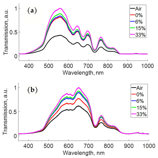 Transmission: (a) straight-line fiber and (b) POFLM fiber with two holes, for different glucose concentrations.