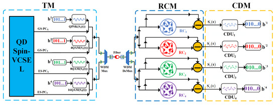 Figure 1 displays the fundamental block diagram of a quad-channel COCSC system, built on four concurrent photonic reservoir computers. This intricate system is composed of the transmitter module (TM), the reservoir computing module (RCM), and the coherent demodulation module (CDM). Within the TM, the ground state of the QD-spin-VSEL generates the chaotic X-PC and Y-PC, marked as GS-PCx and GS-PCy, respectively. Interestingly, its excited state yields two additional photonic currents recognizable as ES-PCx and ES-PCy. Each of the QPSK, 4QAM, 8QAM and 16QAM is IQ modulated with a group of bit sequences (baseband signal). In this scheme, there are four distinct groups of bit sequence signals, as depicted as –, individually. For the convenience of discussion, the temporal dynamics of the QPSK, 4QAM, 8QAM and 16QAM are described by (t), (t), (t) and (t), respectively. The QPSK, 4QAM, 8QAM and 16QAM are masked within the chaotic GS-PCx, GS-PCy, ES-PCx and ES-PCy, respectively. These four channels of chaotic masked signals are integrated into a single optical fiber utilizing a wavelength division multiplexer (WDM Mux). In the RCM, after fiber transmission, the combined signals are partitioned into four-channel chaotic masked signals via a wavelength division demultiplexer (WDM DeMux). Each channel of chaotic masked signal is subsequently bisected into dual beams. A singular beam of chaotic masked signal is introduced to a photonic RC. Here, the predicted outputs from the RC1–RC4 are denoted as the GS-, GS-, ES- and ES-, respectively. Once output weights are precisely trained within the non-linear node states of each photonic RC, the GS-PCx, GS-PCy, ES-PCx and ES-PCy can be perfectly synchronized with GS-, GS-, ES- and ES- correspondingly. In this scenario, signal types QPSK, 4QAM, 8QAM and 16QAM can be demodulated by applying synchronous subtraction between the chaotic masked signal and each RC’s predicted output. These demodulated messages, noted as (t), (t), (t) and (t), are then channeled into their respective coherent demodulation units (CDUs with the subscripts of 1–4). Post coherent demodulation and DSP, four sets of bit sequence signals are further decoded. These reinstated signal bits are referred to as –, respectively.