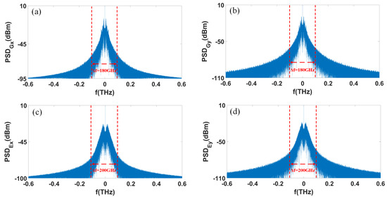 The parameter values for the driving quantum dot (QD) spin-vertical cavity surface-emitting laser (VCSEL) are detailed in Table 1, while those for the reservoir QD spin-VCSEL are outlined in Table 2. Our initial step is to model the power spectral density (PSD) profiles and temporal samples stemming from the driving QD spin-VCSEL, employing concurrent simulations within Matlab (version R2021a) and VPI (version 11.1) software environments. Within Matlab, Equations (1)–(5) are executed via the fourth-order Runge–Kutta numerical approach, adopting a time step (h) of 0.78 ps. The sampling periods for the four distinct input data streams ((n−), (n−), (n−), (n−)) are denoted by T and are uniformly set at 10 ps. The constants , , and are all given the value of 2.0513 , which is based on , being 16 ns and h amounting to 0.78 ps. Concurrently, the dynamical output from the four parallel reservoirs, utilizing the reservoir QD spin-VCSEL, is also modeled with the integration of Matlab and VPI, where Equations (6)–(10) are solved through the fourth-order Runge–Kutta method with a finer time step of 0.048 ps. Within the present framework, both the encoding rate of the messages and the data processing speed of the reservoirs are influenced by the effective bandwidths of the driving and reservoir VCSELs. Figure 3a–d depict the PSD distributions of the GS-PCx and GS-PCy, as well as the ES-PCx and ES-PCy emitted by the driving QD spin-VCSEL. According to the representations in Figure 3, the PSD distributions for these PCs consistently demonstrate chaotic behavior. The effective 3 dB bandwidths for both the GS-PCx and GS-PCy are calculated to be 180 GHz, whereas the ES-PCx and ES-PCy are slightly higher at 200 GHz. Correspondingly, the effective 3 dB bandwidths for the GS-, GS-, ES- and ES- of the reservoir system exhibit similar characteristics to those of their driving system counterparts (GS-PCx, GS-PCy, ES-PCx and ES-PCy, respectively). These outcomes suggest that our system is capable of achieving high-speed, four-channel coherent optical chaotic secure communications.