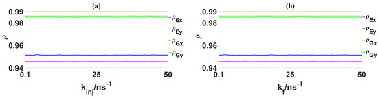 In Figure 6, the correlations , , and are shown as a function of and . It can be observed that , , and exhibit minimal changes as and increase in the range of 0.1 to 50 . Within these two parameter spaces, and both range between 0.9849 and 0.9857, while and fluctuate between 0.949 and 0.96. This indicates that , , and possess strong robustness to variations in and , which are key parameters of the reservoir QD spin-VCSEL. Furthermore, as all , , and are greater than 0.949, it can be concluded that the GS-, GS-, ES- and ES- can effectively synchronize with the delayed GS-PCx, GS-PCy, ES-PCx and ES-PCy, respectively. Notably, and are higher than and , respectively. This is attributed to the fact that the and for the GS-PCx and GS-PCy are lower compared to the and for the ES-PCx and ES-PCy, respectively.