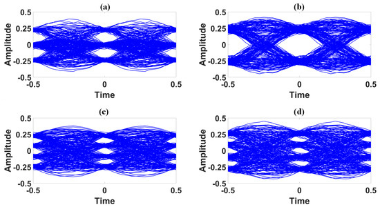 Eye-diagrams of the decoded messages ((n), (n), (n) and (n)). Here, (a) the eye-diagram of (n); (b) the eye-diagram of (n); (c) the eye-diagram of (n); and (d) the eye-diagram of (n).