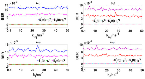 The bit error rate () is a commonly utilized metric to gauge the quality of data transmission in optical chaos-based secure communication systems [15]. The is defined as the ratio of the number of errored bits to the overall number of bits transmitted. Figure 9 showcases the dependences of the s for the decoded messages ((t), (t), (t) and (t)) and their associated baseband signals (, , and ) on two key parameters ( and ). As evidenced by Figure 9(a1,a2), the s for (t), (t), (t) and (t) exhibit oscillatory behavior as is adjusted within the range of 0.1 to 50 . Their values, respectively, fluctuate within the following ranges: from 1.02 to 1.22 for (t), from 6.1 to 7.5 for (t), from 3.4 to 6.1 for (t), and from 7.1 to 9.2 for (t). Within this range, all four decoded messages demonstrate minor oscillatory fluctuations in their s. The s cap at 1.5 for (t) and at 8.7 for (t), while those for (t) and (t) do not surpass 3.4 and 9.5 , respectively. Based on findings from earlier studies [28,29,30], a that closes at or below 0.01 is indicative of potentially high-quality data transmission within an optical chaos communication framework. As depicted in Figure 2c, when demodulated through correlation and refined by various digital signal processing methods, four distinct baseband signal sets (or bitstreams) encapsulated within the decoded messages (t), (t), (t) and (t) are successfully reconstructed. Consequently, the ranges for these retrieved baseband signals (, , and ) remain constant and effectively zero, irrespective of and variations. Figure 10 delves into the performance of the four retrieved baseband signals by presenting their temporal trajectories and eye-diagrams alongside those of the original baseband signals –. An inspection of Figure 10 reveals a striking similarity between the temporal profiles of the original signals , , and and their retrieved counterparts , , and , respectively. The eye-diagrams corresponding to the original and retrieved baseband signals also correspond closely, with , , and , showing a remarkable resemblance to , , and . Notably, the eye openings in the eye-diagrams for , , and are sufficiently large, which is an important indicator of signal integrity. The insights gathered from Figure 9 and Figure 10 strongly support the effectiveness of our proposed coherent optical chaotic communication system in delivering secure and high-quality data transmission.