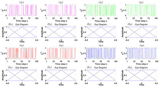 Temporal trajectories and eye-diagrams of the original baseband signals – and their respectively retrieved baseband signals –. Here, (a1,a2) the temporal trajectories of the and , respectively, and (b1,b2) their respectively eye-diagrams. (a3,a4) the temporal trajectories of the and , respectively, and (b3,b4) their corresponding eye-diagrams; (a5,a6) the temporal trajectories of the and , respectively, and (b5,b6) their respectively eye-diagrams; and (a7,a8) the temporal trajectories of the and , respectively, and (b7,b8) their corresponding eye-diagrams.