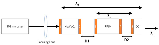 - Kneller, J.; Flannigan, L.; Xu, C.-Q. Theoretical study of diode pumped intracavity backward optical parametric oscillator based on periodically poled lithium niobate. Appl. Phys. B 2023, 129, 99. [Google Scholar] [CrossRef]