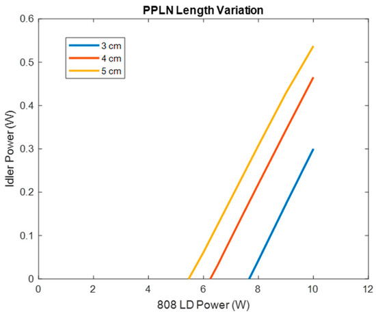 Figure 4 suggests that there are diminishing returns when increasing the PPLN length in terms of the maximum achievable output idler power. As previously mentioned, increasing the PPLN length from 3 to 4 cm resulted in an increased output power of roughly 50%, while the PPLN length was increased by only 30%. Comparing this to the 20% increase in output power when increasing the PPLN length from 4 cm to 5 cm, it is clear that increasing the PPLN length does not have a linear effect on output power. This can be explained as follows: while the conversion efficiency is dependent on the length of the PPLN, increasing the PPLN length also increases the size of all three beams within the cavity, reducing the intensity. Additionally, as the conversion efficiency increases with increased PPLN length, so does the nonlinear loss term present in Equation (7), which reduces the intracavity 1064 nm power. The diminishing returns in output power when increasing PPLN length is important to consider as a longer PPLN will increase the device footprint, as well as increase the cost. Furthermore, maintaining a high quality duty cycle over a longer crystal is an additional challenge which could further reduce device performance.