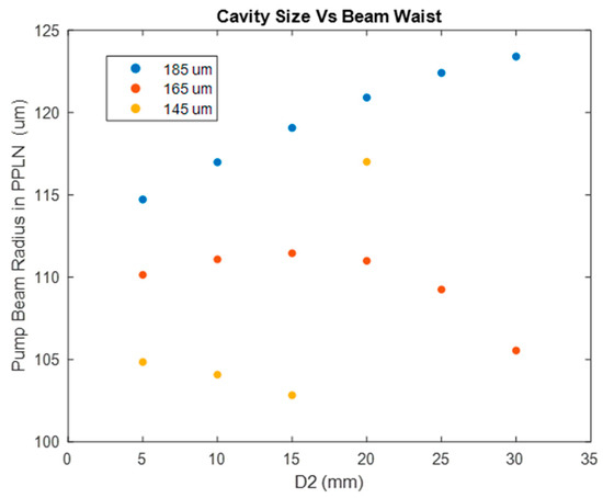 Figure 5 shows the beam radius of the 1064 nm beam in the PPLN crystal for various D1 values and various 808 nm beam spot sizes. For all data points shown in Figure 5, D2 was set to 5 mm and the PPLN length was 5 cm. From Figure 5, two observations can be made. The first is the importance of choosing an optimum 808 nm beam waist to achieve the minimum 1064 nm beam radius in the PPLN crystal for a given cavity configuration. The second is that the smaller the 808 nm beam waist, the smaller the cavity must be to remain geometrically stable.