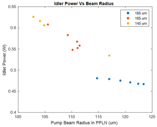 Figure 6 shows the calculated idler power at each of the data points shown in Figure 5. For both the 185 μm and 145 μm beam waist, we see that the idler power decreases roughly linearly with the pump beam radius. For the 165 μm beam waist, only part of the data points follow this trend. The explanation for this is as follows: for the three data points with the lowest output powers, the change in beam waist between the three data points is small, only about 1% between each of the data points. At the same time, the change in the overlap integral between the pump and signal increases by about 2% as the 1064 nm beam waist increases due to the large radius of the signal beam in the PPLN, which offsets the reduced intensity. As the beam radius continues to decrease, the change in increased intensity eventually overcomes the loss due to the reduced overlap integral, which resulted in a higher output power. Due to the beams being concentric within the PPLN crystal, the overlap integral value generally remains quite high, >80%, and does not change much when the radius of any of the beams change. As a result of this, we found that it is better to design the cavity to minimize the beam waist in the PPLN crystal than to focus on increasing the overlap integral.