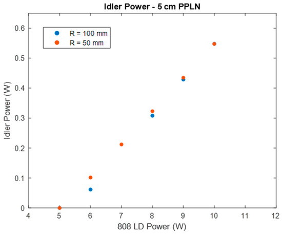 Figure 8 shows a comparison of the idler output power using a 3 cm PPLN for both a 50 and 100 mm OC radius. The 808 nm LD beam waist was set to 165 μm. D1 and D2 were both set to 5 mm. From Figure 8, a substantial increase in output power can be seen when using a 50 mm OC as opposed to a 100 mm OC. The output power increased from 300 mW, when using the 100 mm OC, to 370 mW when using the 50 mm OC. In addition to the increase in output power, the threshold of the laser is also reduced when using the 3 cm PPLN, from 7.5 W to 6.5 W.
