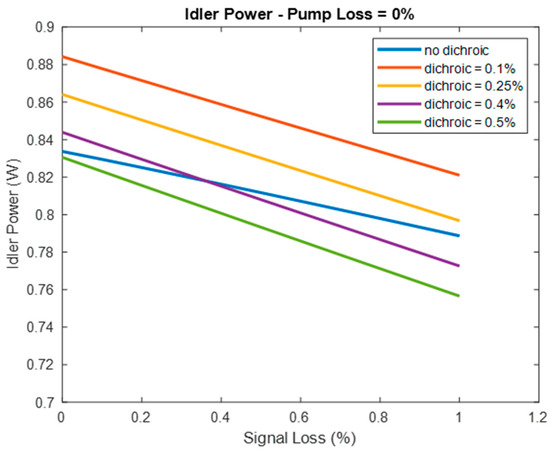 As expected, when the loss of both the dichroic mirror and laser cavity is low enough, the backwards travelling idler power is larger than the forwards travelling idler, indicating that it is advantageous to use the dichroic mirror to extract the backwards travelling wave. However, the gain in output power is small. When both the pump and signal cavity have a loss value of 0%, and the loss introduced by the dichroic mirror to the pump wave is set to 0.1%, the backwards travelling idler wave has an output power roughly 6% higher than the forwards travelling idler with no dichroic mirror present in the cavity. As the loss values of the dichroic mirror and signal cavity loss are increased to more realistic values, we see that the output powers of the different cases become smaller until the loss due to the dichroic mirror causes the forwards travelling idler to perform better. While theoretically it is possible to improve the performance with the dichroic mirror and extract the backwards travelling, low enough loss values would be extremely difficult, if not impossible, to result in a performance improvement.