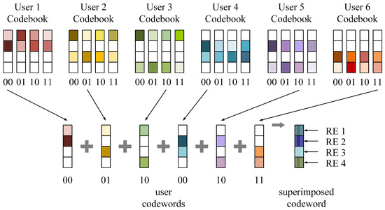 Figure 2 shows the process of mapping and superimposing for SCMA codewords in the case of , and . In each user codebook, the different codewords are shown in different colors and the unused REs are shown in white. The corresponding relations between the users and REs of SCMA codebook can be represented by a factor graph matrix , where each row represents a RE and each column represents a user. means that user j occupies the RE k for transmission. The factor graph matrix corresponding to Figure 2 is given as