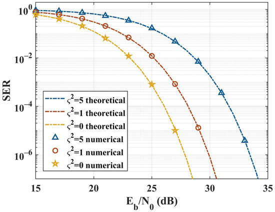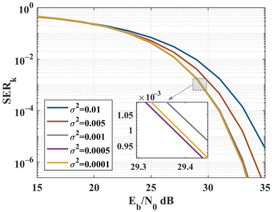 Let denote the SER of superimposed codewords on arbitrary RE. From Equation (18), the system SER is mainly determined by the SER of one-dimensional superimposed codewords.