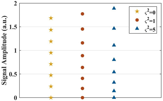 According to Gray mapping, the codewords in correspond to the user data bits multiplexing the same RE. Figure 5 shows a schematic of the above codebooks. In the superimposed codebook , the Euclidean distance between the codeword with the maximum amplitude and its adjacent point is 0.425, while the Euclidean distance is 0.321 in . This shows that a larger value of leads to a larger Euclidean distance between the codeword with high amplitude and its adjacent points. When , all adjacent points in have approximately equal Euclidean distances of 0.239, resulting in the maximum MED. This design scheme can also be applied to optimize the codebook of systems when only thermal noise is considered.