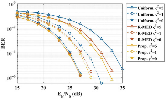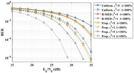 Figure 8 provides the BER performance of all three codebooks with , where the overall curve trend is comparable to that shown in Figure 7. In the case of , the proposed codebook can achieve 2.6 dB and 0.4 dB gains at a BER of compared to those of the uniform-distributed codebook and R-MED-based codebook, respectively. In the case of , the proposed codebook can achieve 1.1 dB and 0.2 dB gains at a BER of . The above results demonstrate that the proposed codebook outperforms other codebooks under shot noise. We found that, in order to achieve a BER of under , the minimum of the proposed codebook is 33.3 dB for , which is a 5.4 dB increase compared to the case of . To achieve a BER of under , the minimum of the proposed codebook for has a 5.1 dB increase compared to the case of . As the overload factor increases, losses in the BER performance are inevitable.