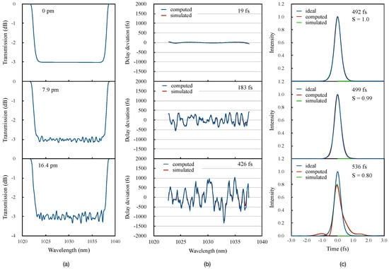 Simulation of CFBGs with various amounts of period noise: (a) transmission spectrum; (b) group delay ripples; (c) recompressed pulse for 0, 7.9 pm, and 16.4 pm period fluctuation (from top to bottom). The GDR, recompressed pulse duration and Strehl ratios are indicated on each graph. Blue and red curves are for numerically computed and simulated measurements, respectively.