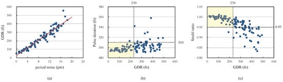 Simulation of 114 CFBGs: (a) GDR vs. period noise; (b) pulse duration vs. GDR; (c) Strehl ratio vs. GDR. The shadowed areas indicate the acceptable GDR limit for 510 fs duration and 0.95 Strehl ratio.