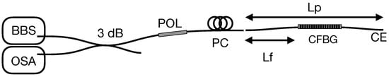 The measurement setup is illustrated in Figure 3. The light from the broadband source (BBS) travels to the CFBG through a coupler (3 dB), followed by a fiber polarizer (POL), and a polarization controller (PC). The fiber used in that part is circular-core, non-PM fiber. The PM fiber pigtail of the CFBG under test is connected either with a fusion splice or a mechanical splice. The reflection retrieved from the other branch of the coupler is sent to the optical spectrum analyzer (OSA). Alternatively, a tunable laser source could be used in conjunction with a photodetector. Tunable lasers are usually already polarized, and in that case, a second PC may be used before the polarizer to ensure maximum transmission through it. The cleaved end (CE) of the pigtail is only used to measure the birefringence of the fiber, as described later, and would otherwise be cleaved at an angle to avoid back reflections.