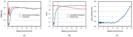 (a) GDR vs. ripple period for the computed and simulated measurement cases; (b) ratio of GDR obtained from the simulated measurement to that obtained from the computed spectrum, along with the Strehl ratio vs. the ripple period; (c) pulse duration vs. ripple period.