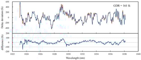 Group delay ripples for two successive measurements (red and blue curves) of the CFBG of Figure 5 (upper curve), and the difference between the two (lower curve). The indicated GDR value of 161 fs was the same for both measurements.